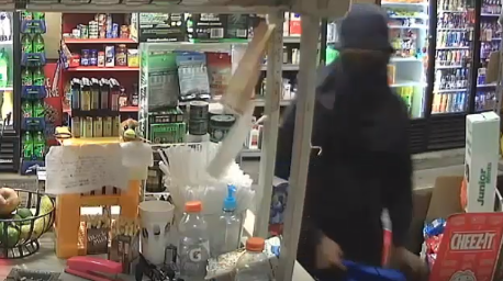 The suspect can be seen in the video wearing all black, with his face covered.