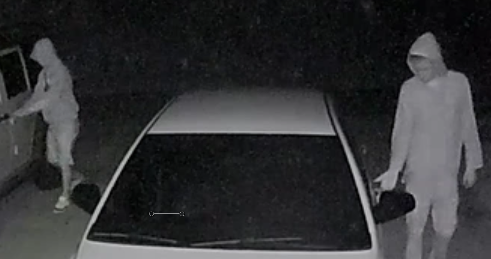 Security video shows two suspects simultaneously trying to open two vehicles in one driveway. Their attempts were stopped short when a car alarm was activated, and sent the two burglars running.
