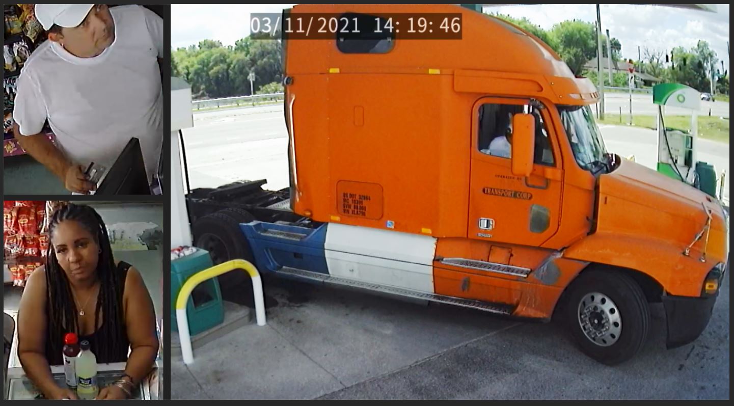 The man and woman pictured are the two suspects who detectives are trying to identify, and the orange semi-tractor was used by the couple to commit the theft.
